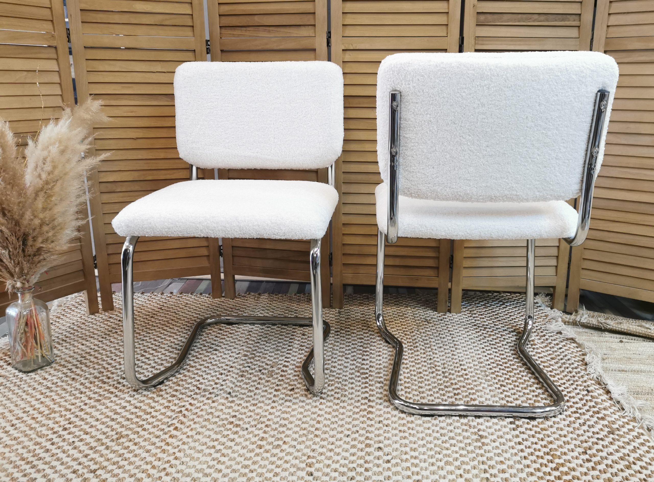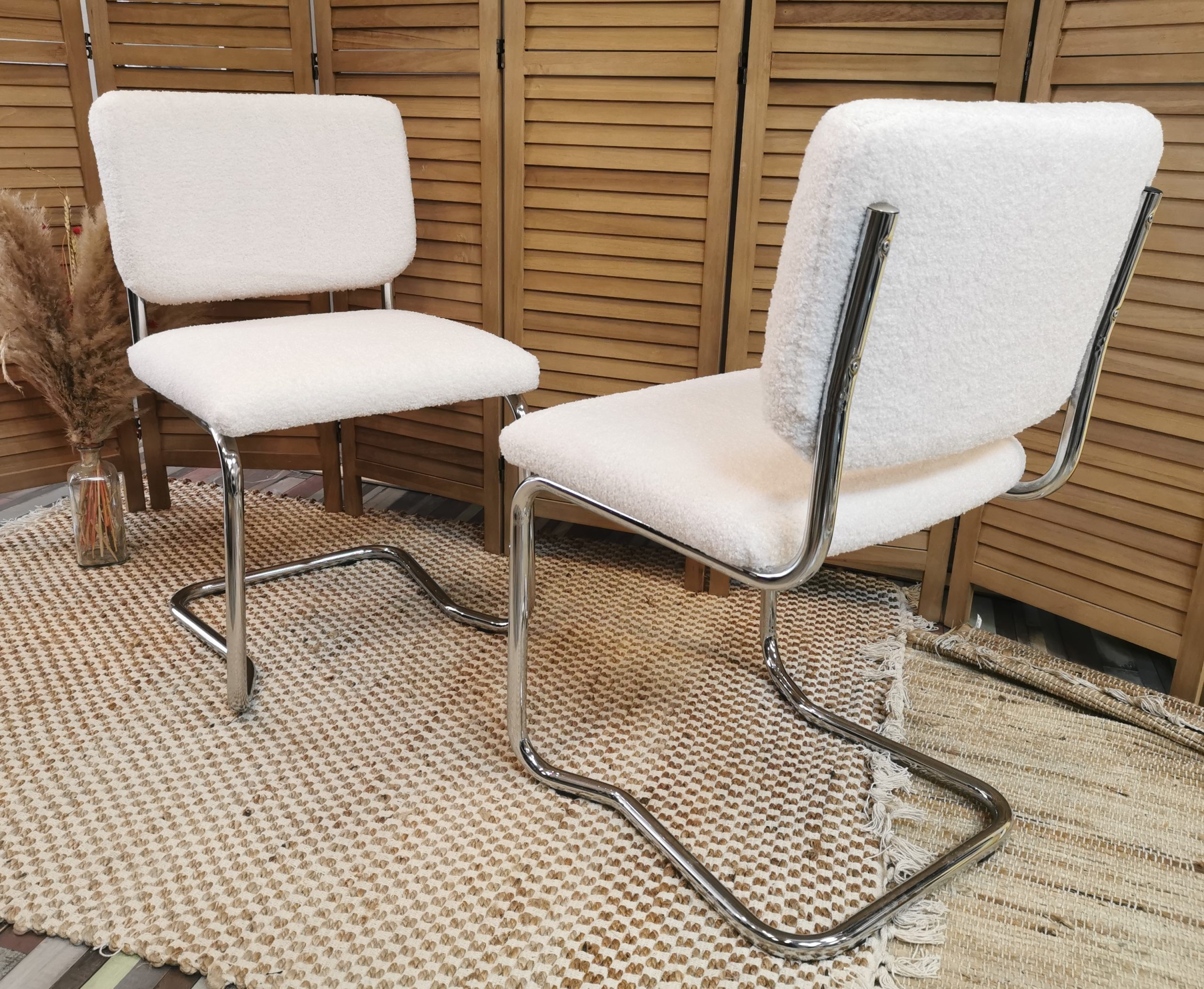 Chaises au design des années 60/70. Restaurées en tissu bouclé blanc. Pieds en tube d’acier finition chromée. Dimensions Assise 48x43cm/dossier 48x30cm hauteur 83cm. prix pour le lot de 4 . Vendu.